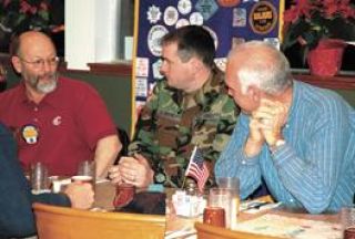 Kiwanis Club of Buckley members Dave Huddleston and Jay Hambly learn about Army life from Staff Sgt. Derek Elsberry before breakfast Thursday morning at the 410 Cafe. The Kiwanis Club honored Elsberry and six others - Sgt. First Class Richard Hall, Sgt. Patrick Roop, Staff Sgt. Steven Payton, Sgt. First Class Dante Elliott, Sgt. Daniel Vincent and Sgt. First Class Sean