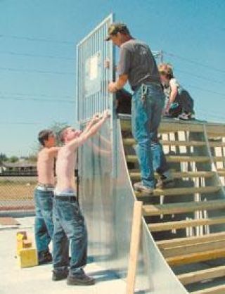 Buckley skaters and residents, Ryan Kerby, Thomas Richards, Bob Beach, Ted Beach and Quentin Money help install a quarterpipe at the Buckley skatepark. Work on the skatepark started Saturday and the ramp components were expected to be completed by Monday. A date for the official grand opening of the park had yet to be set at press time.