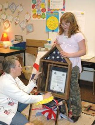 Patty and Kim Lingnaw and Jewel's mother brought the flag to the school May 22 wrapped in red, white and blue paper and tied up with a ribbon. The package was opened in class and inside was an encased flag with a proclamation thanking Jewel and her classmates.