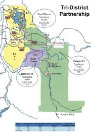 The three districts are Pierce County Fire District 12 (headquartered on 234th, between Buckley and Bonney Lake), South Prairie Fire District 20 and East Pierce Fire and Rescue or District 22.