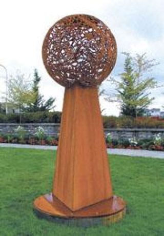 The sculpture is a detailed, flame-cut 50 inch sphere on a three-sided pedestal.