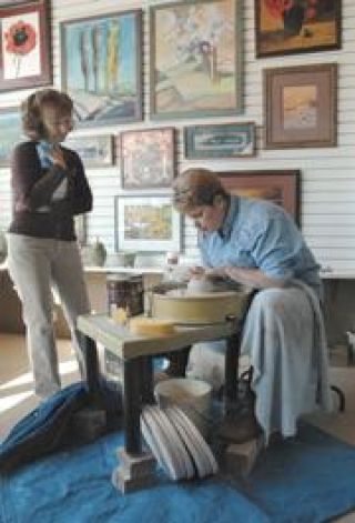 Enumclaw artist Liz Reynolds throws a piece of clay for guests at Elk Hills Gallery during Saturday evening's Art Walk and Jazz in downtown Enumclaw. Business owners opened their doors to artists and patrons during the event.