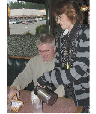Gail Poole serves coffee to Orting resident Dale Divelbiss