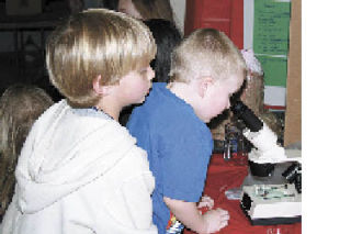 Black Diamond Elementary School students Kendrick Herbst and Michael Bennett take turns looking through a microscope
