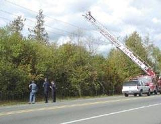 That afternoon, another officer spotted the suspect - he was again along the highway and again darted into the trees and blackberry bushes. Numerous officers responded this time, assisted by the Buckley Police Department (which had also helped earlier in the day) and a ladder truck from the local fire department. A firefighter was hoisted to the top of the ladder, where he used thermal-imaging equipment to keep tabs on the suspect. The specialized equipment detects body heat and the firefighter was able to tell police on the ground which direction to head.