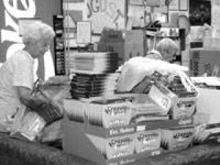 An annual charitable effort in Enumclaw is the stuffing of backpacks for children from needy homes. Monday morning, kids from the Youth Center teamed with volunteers from the Enumclaw Senior Activity Center to fill backpacks. Above, Lila Hirschkorn helps fill a pack; between 200 and 300 were prepared and were to be distributed this morning (Wednesday) at the Youth Center. Aside from school supplies, the packs include a certificate for a pair of shoes.
