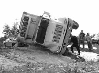 According to Pierce County Fire District 12 Chief Bill Steele, the truck was traveling eastbound on state Route 410 when it turned and toppled onto a Mitsubishi sedan traveling in the westbound lane, injuring the female driver. Steele said that although the victim's injuries were serious, they were not life-threatening.