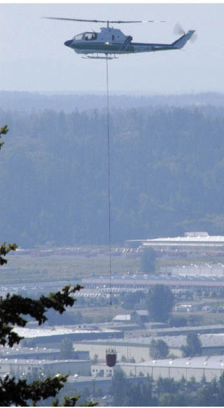 The fire spread up the hill and fire crews were unable to reach it on foot. East Pierce called in two helicopters – one from DNR and another from Northwest Helicopter Services of Olympia – to scoop water from Lake Tapps and Hidden Lake to help extinguish the blaze.