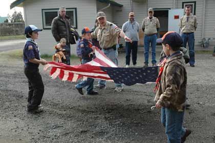 Cub Scouts from Pack 500 and Boy Scouts from Troop 422 helped the Enumclaw Veterans of Foreign Wars Post No. 1949 retire flags Sunday. Approximately 25 American flags were part of the ceremony which retires Old Glory with honor and dignity. The post collects flags throughout the year. Flags can be taken to the post or dropped at Radio Shack in Enumclaw.