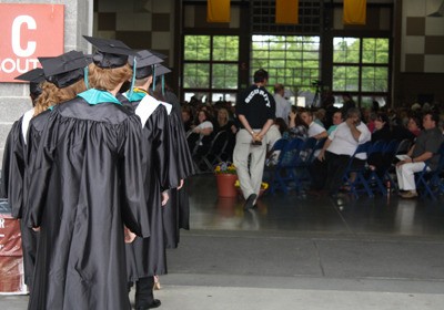 Graduating Panthers wait pensively outside an expo center filled with family and friends before the ceremony begins.