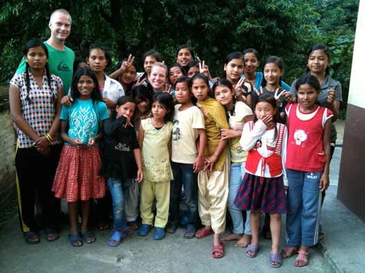 Laura Handy-Nimick and Justin Nimick pose among students during a trip to the Nepal Orphans Home.