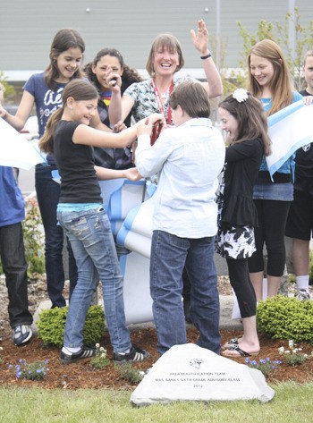 Students at Lakeridge Middle School cut the ribbon today on new flora around the Bonney Lake campus’s welcome sign.