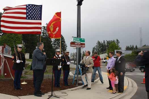 Bonney Lake Mayor Neil Johnson and the entire city council were joined Friday by the 4th landing Support Battalion Marine Corps Color Guard Unit and members of the American Legion of Washington as the city officially unveiled a sign proclaiming Veterans Memorial Drive East.
