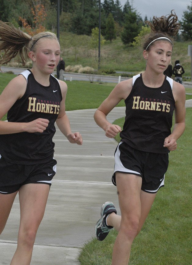 Enumclaw overall placers: Aleea Gwerder, first, 21:23; Samantha Engebretsen, second, 21:24; Abby Callison, fourth, 22:15; Amanda Stenslie, fifth, 22:41; Reilly Desmul, sixth, 22:54; Danielle Flintoff, eighth, 23:38; Bryn Zeman-Witzel, ninth, 23:47.