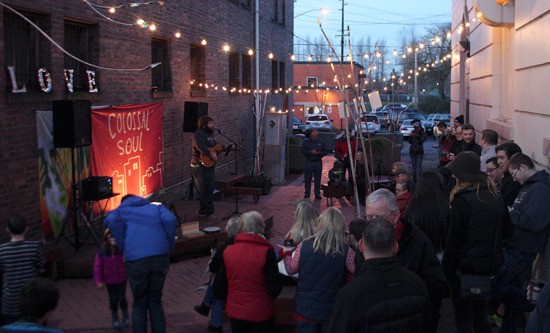 Last Saturday night, after the Community Dinner, the Rhubarb Alley downtown was filled with lights, music, people and hot cocoa. It was beautiful. With the support of the Sumner Arts Commission, a group known as Colossal Soul had organized this holiday sing along with Sumner performer James Coates. Dillanos Coffee Roasters offered the hot cocoa, and participants gathered food for the Sumner Food Bank.