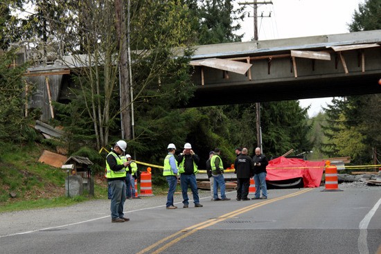 UPDATE: The Bonney Lake Police Department PIO Twitter account reported a family of three, an infant child, mother and father in mid 20s, were killed when a large portion of concrete fell from SR 410 onto a truck on Angeline Road.