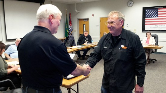 Victor Proulx shakes Fire Commissioner Dave Mitchell's hand after Proulx is sworn in as a new commissioner.