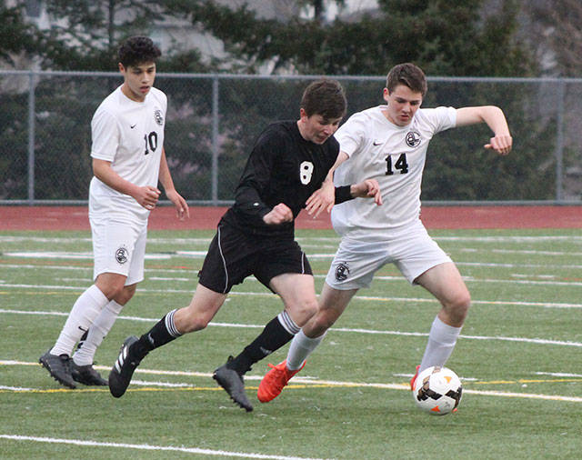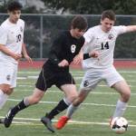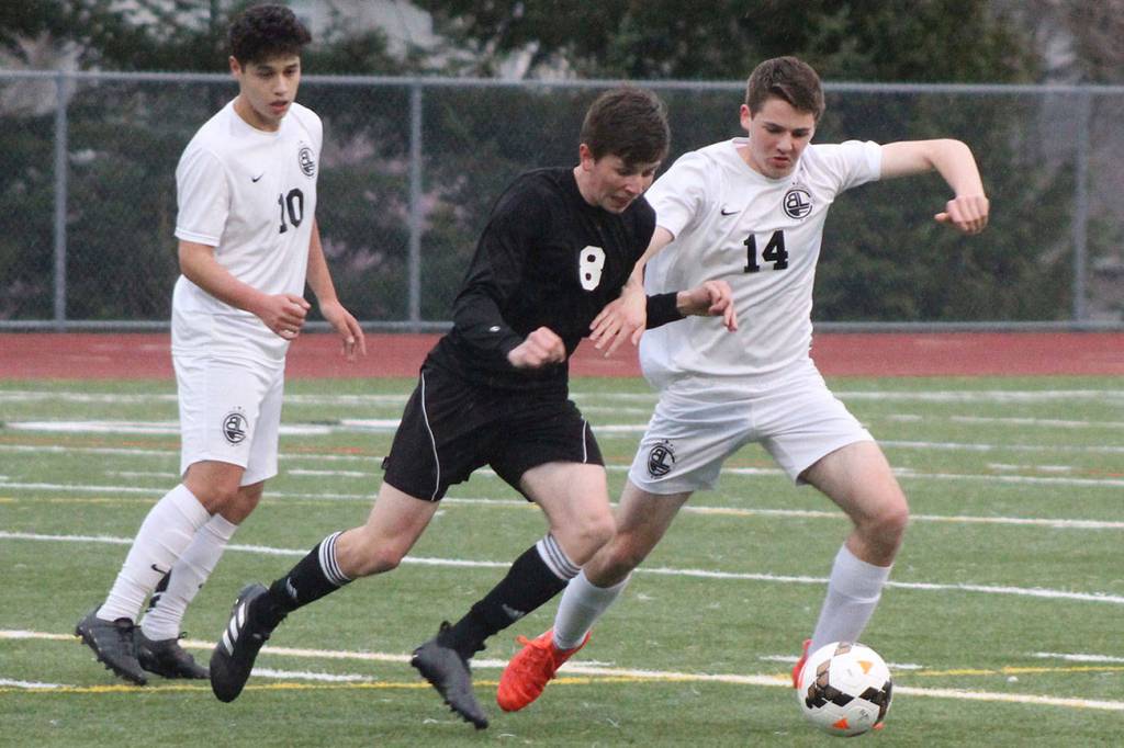 Bonney Lake High School senior defender Ryker Penner, above, battles for possession during the Panthers’ April 4 game against Spanaway Lake.