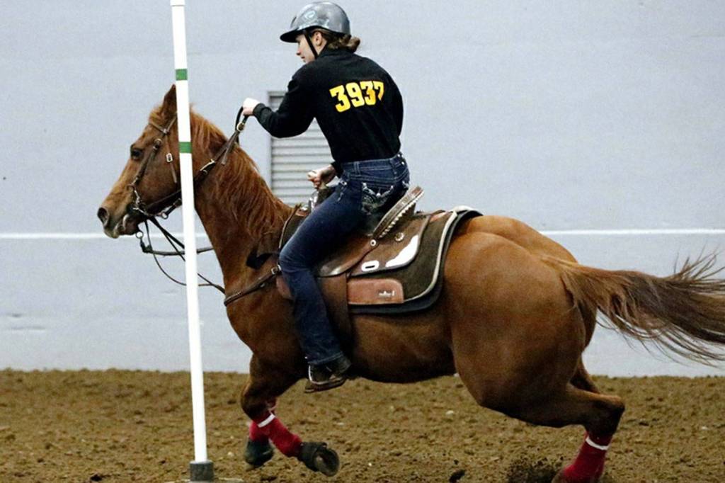 Enumclaw’s Emma Schmidt on the way to a district record in pole bending. Contributed photo.