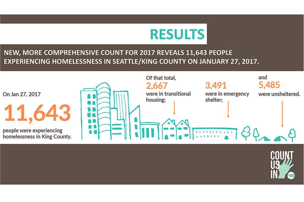This year, a total of 11,643 homeless King County residents were counted on Jan. 27 by 160 paid guides and surveyors and around 600 volunteers.