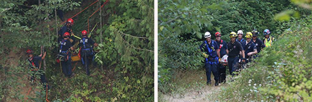 It took the rescue teams approximately one hour to get the woman back up to the trail using a hoisting system due to the heavy brush and trees growing on the hillside. More than technical rescue firefighters were part of the incident.