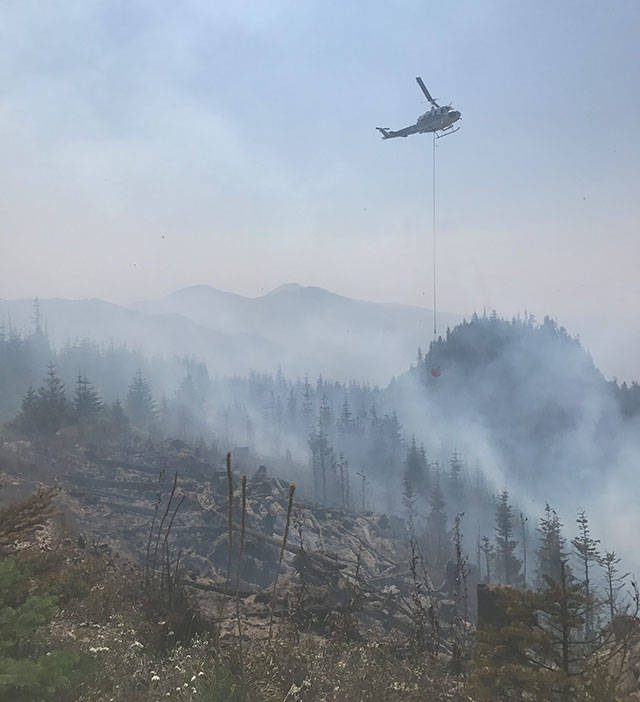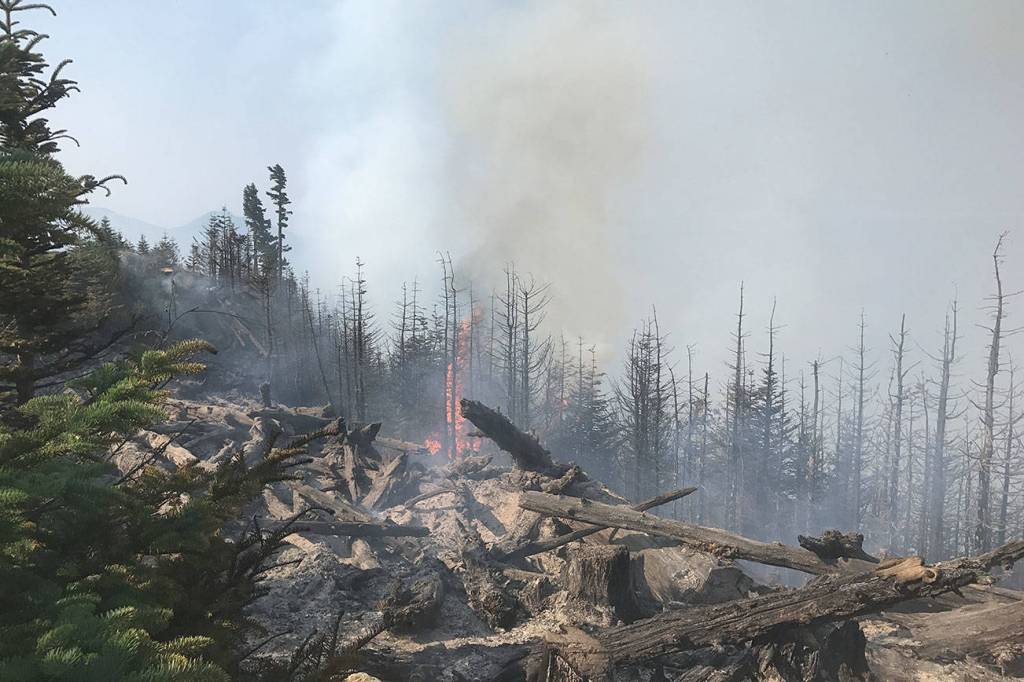 The Burnt Mountian fire was burning on steep ground with rocks and cliffs. The fire was about 10 percent contained by Aug. 10.