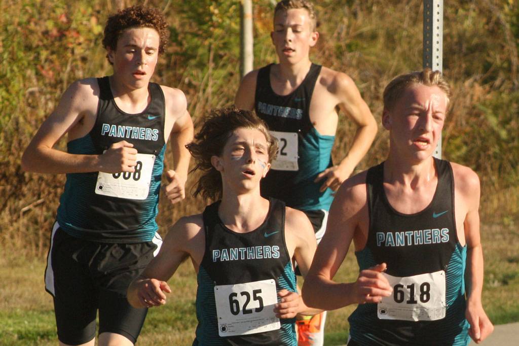 Left, Billy Rohrbough (625), Max Lea (618), and Kyle Davenport (602) run the Eismann Elementary School Course.