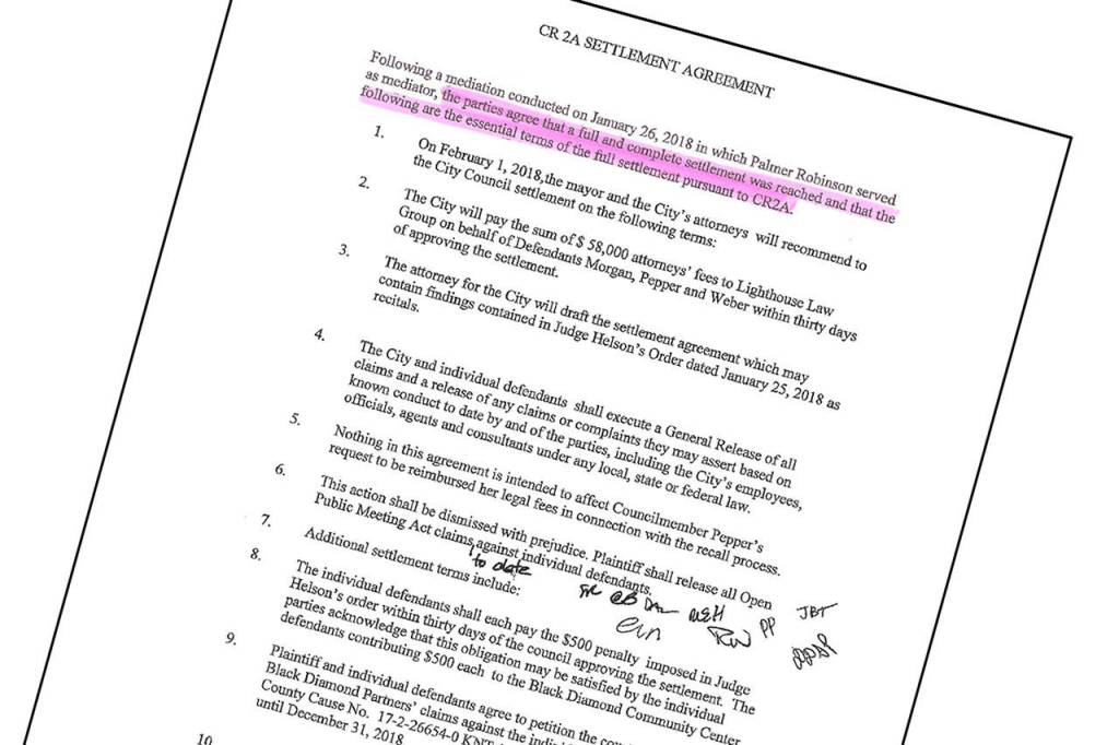 The agreement stipulates Pepper, Weber and Morgan will pay $500 each for the one instance they were fined for violating the OPMA. The three defendants can fulfill this obligation by contributing their fines to the Black Diamond Community Center.