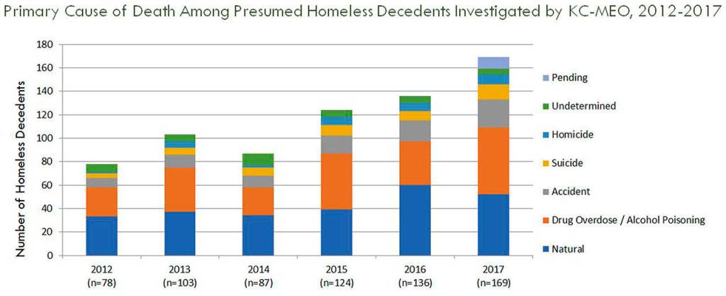 In 2017, the King County Medical Examiner’s Office (MEO) investigated the deaths of 169 people who were homeless at the time. That’s an increase of 32 deaths compared to the previous year — and more than double the number of deaths from six years ago, according to a new report from the MEO.