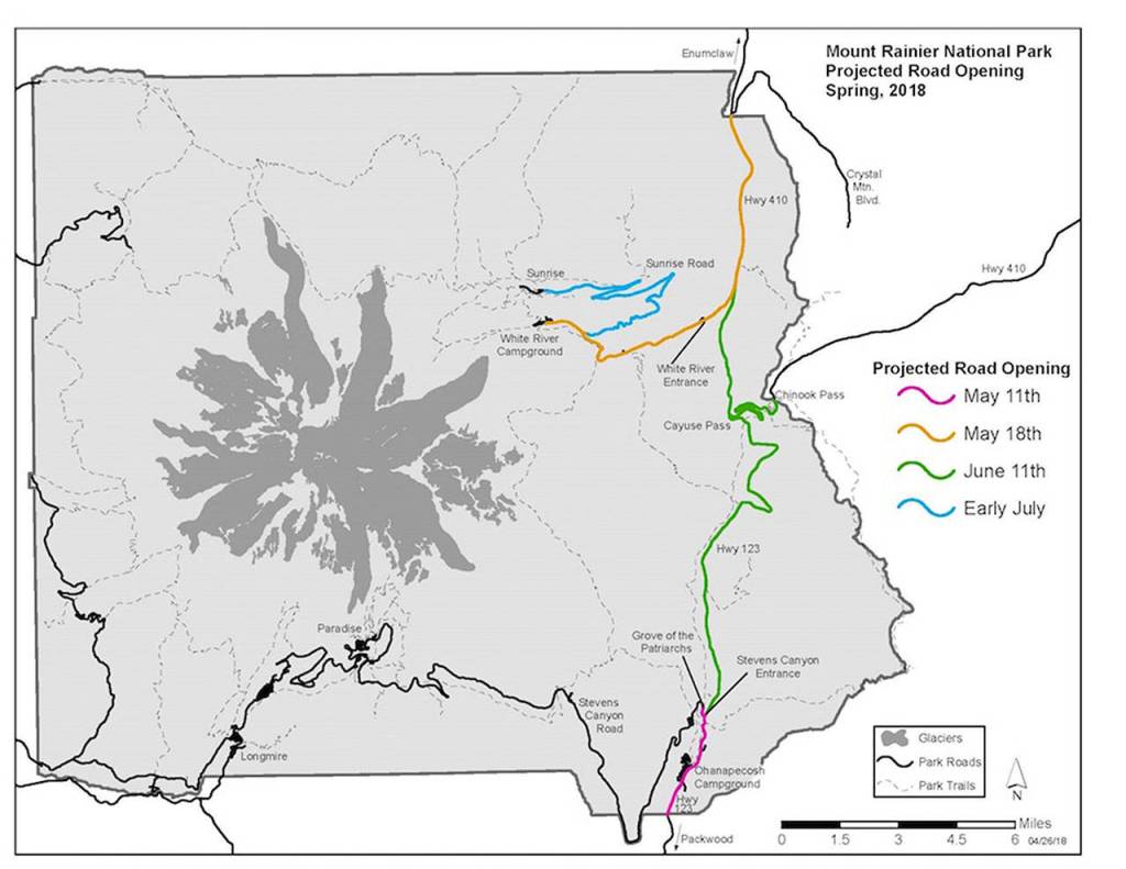 The northeast entrance to Mount Rainier National Park near Enumclaw is expected to open on May 18, with access via SR 410 from the park entrance near Crystal Mountain Boulevard to the White River Campground parking lot. This will provide recreational opportunities in the White River area of the park in advance of the road to Sunrise opening for the summer. Conditions permitting, the road to Sunrise typically opens by the July 4th weekend.