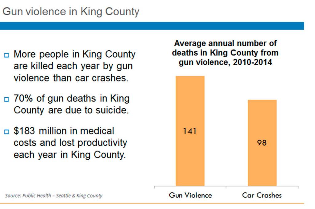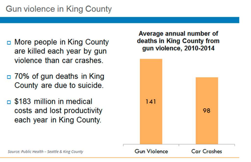 Firearm-related injury and death, from suicide to accidental injury and homicide – is a major public health problem and a leading cause of premature death in King County and nationally. In 2016, 663 adults and 20 children died from a firearm injury in Washington state, including 144 adults and 7 children from King County.