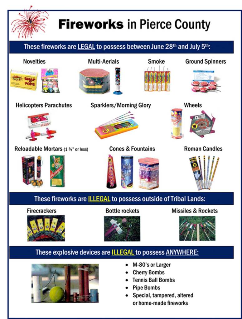 If you chose to light fireworks, be aware of your area’s fireworks discharge laws. Visit www.eastpiercefire.org for a list of restrictions.