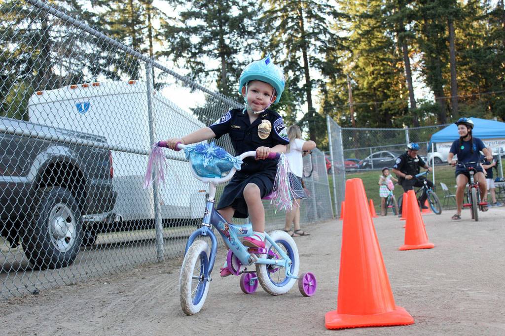 Rory Thayse came out in her Chief For A Day uniform to welcome all comers to Bonney Lake’s annual National Night Out last week, Aug. 7. Photo by Ray Still