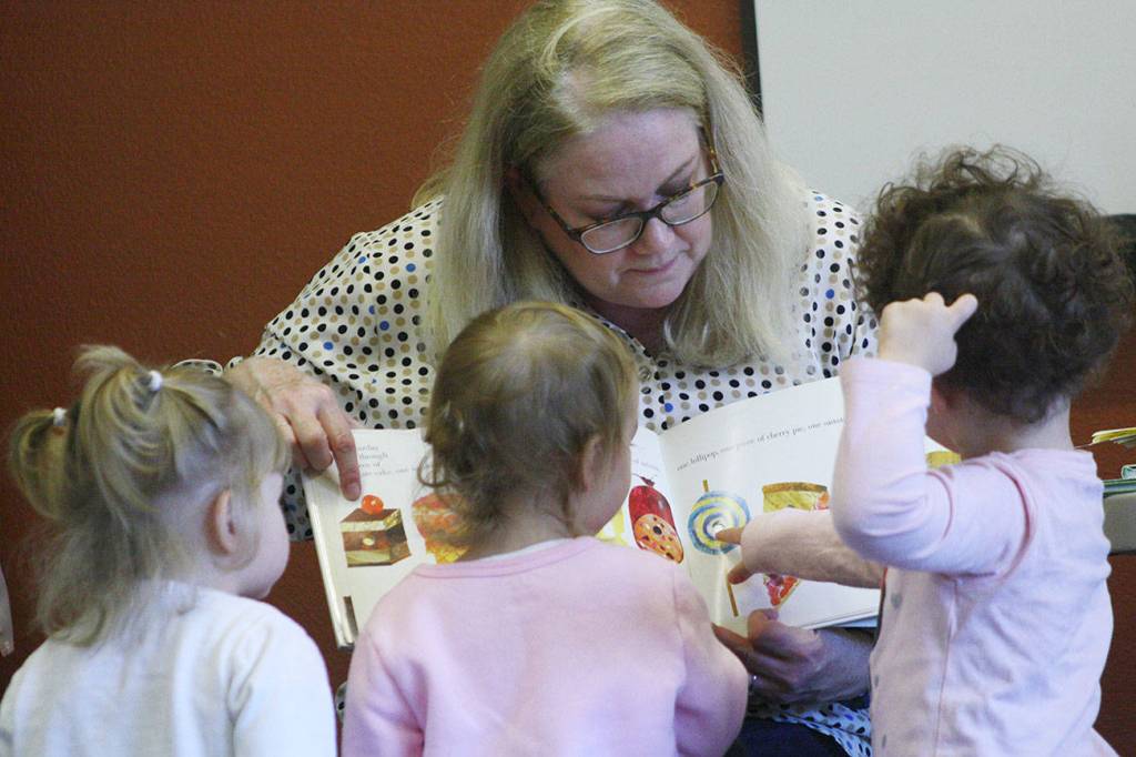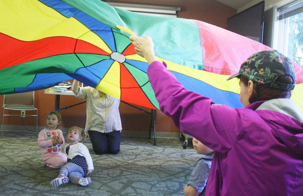 Catherine O’Brien, youth services librarian, keeps kids’ attention during an Oct. 11 session of Family Story Time at the Bonney Lake library. The hour-long program also included games and interactive play with a colorful parachute. KEVIN HANSON PHOTOS