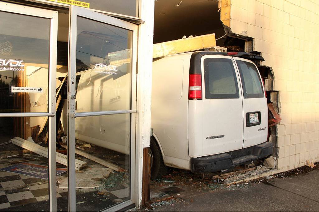 But when a van pummeled into his business on the corner of Stevenson and Garrett in Enumclaw, he said he “never had an adrenaline rush like that.”