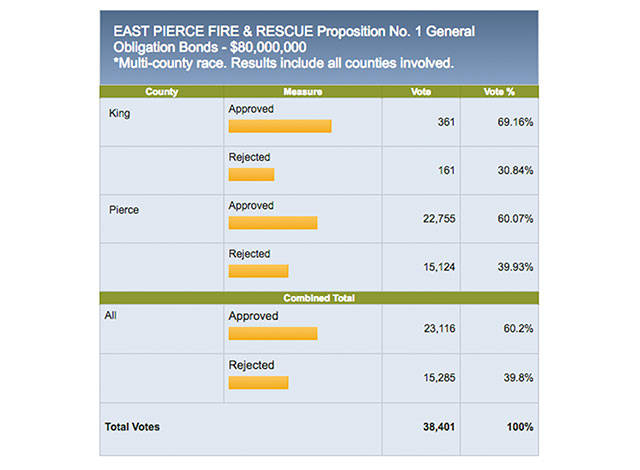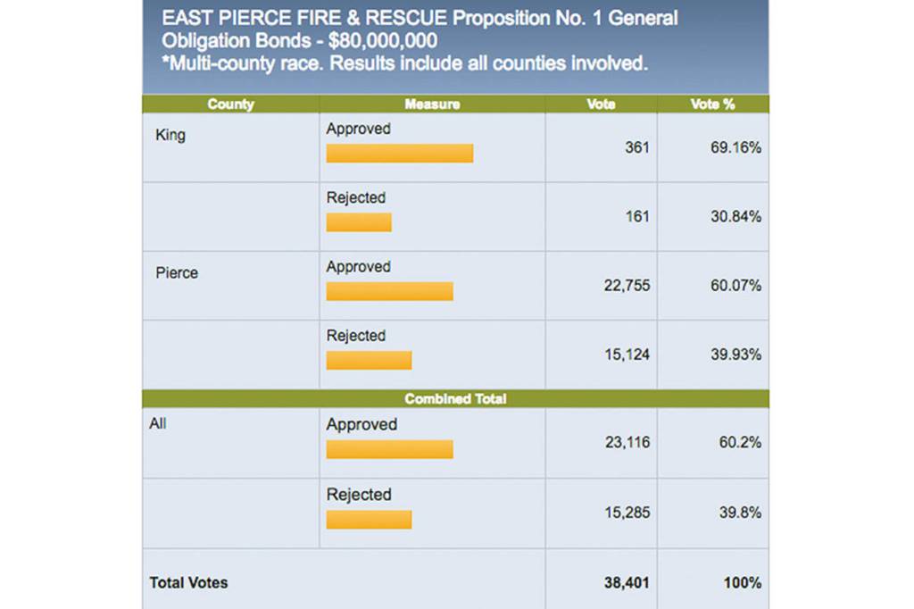 Backer added that East Pierce isn’t out of the fight yet, however. He said the commissioners will be discussing next steps during the Nov. 20 meeting if voters haven’t pushed the bond past the 60 percent margin by that time.