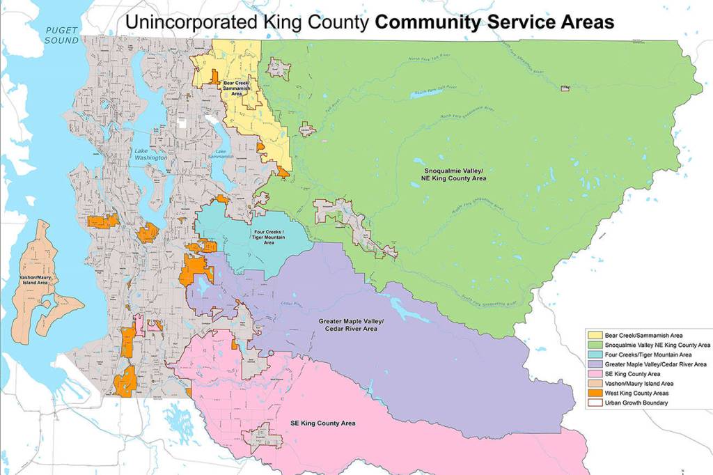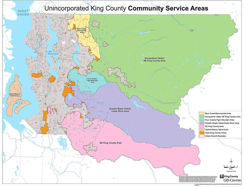 King County has seven Community Service Areas, or CSAs: the Snoqualmie Valley Area and Bear Creek/Sammamish Area up north, the Four Creeks/Tiger Mountain Area, the Greater Maple Valley/Cedar River area in the middle of the county, the western Vashon/Maury Island area and various pockets of unincorporated King County land in West Seattle, and finally, the Southeast King County area, which serves primarily services Enumclaw, Black Diamond, southern Covington and Maple Valley, and east Auburn.