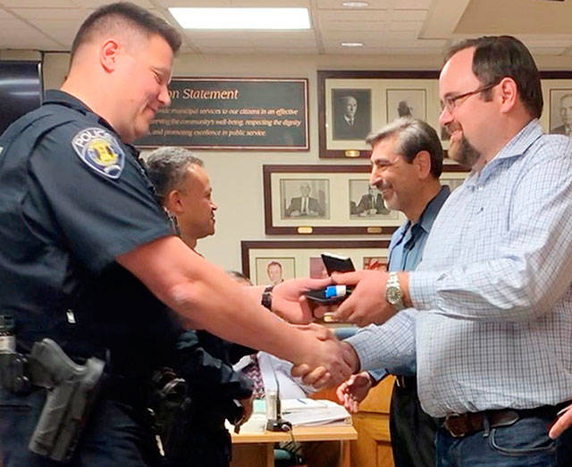 Appearing before the Enumclaw City Council on April 8, Police Chief Bob Huebler explained that the lifesaving actions followed a single-car crash on Griffin Avenue. It was Oct. 29, 2018, when a driver left the road and wound up in a residential lawn. A 911 call at the time noted it was uncertain if the victim was breathing.