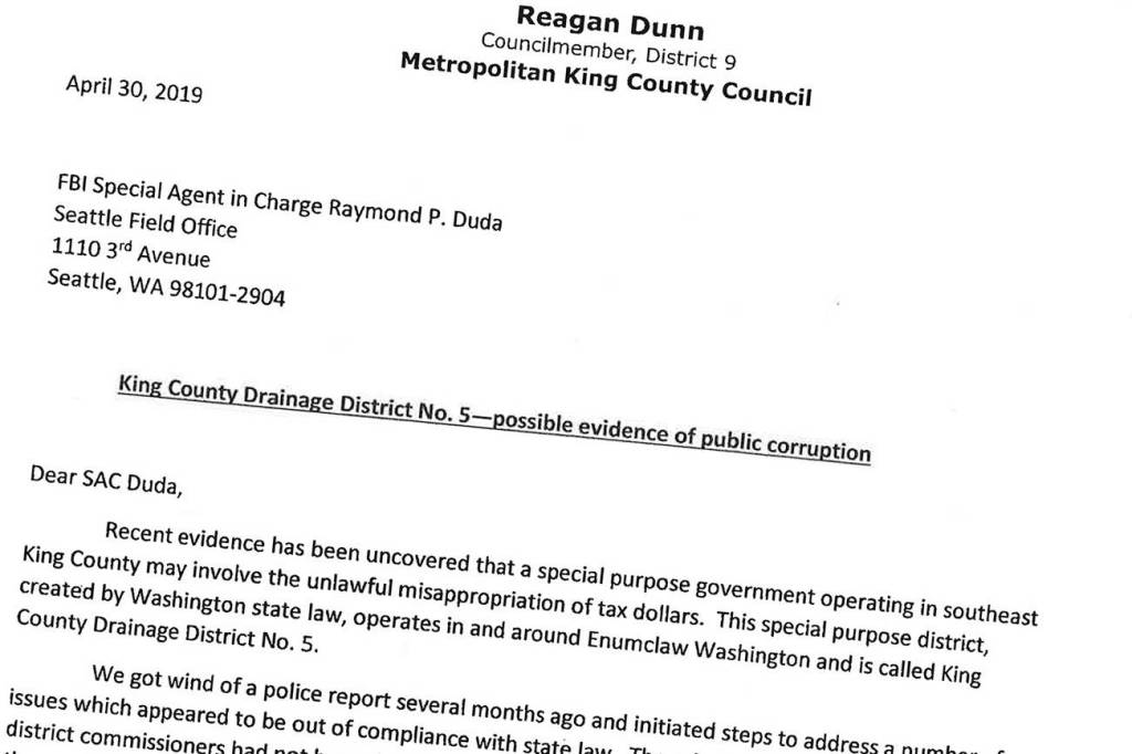 The investigation into Drainage District 5 and one of its commissioners, Allan Thomas, continues while King County Councilman Reagan Dunn raises the stakes.