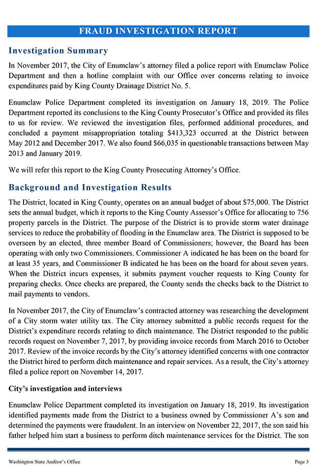 The report, published May 22, 2019, outlines the investigation, which began when the Enumclaw City Attorney called the Auditor’s hotline about the potential misappropriation of public money back in November 2017.