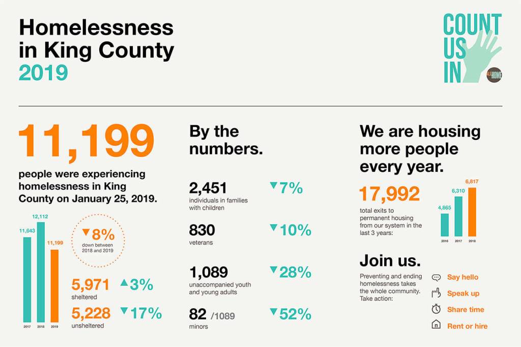 Count Us In 2019, King County’s annual homelessness count, found 11,199 people experiencing homelessness across the region on Jan. 25, 2019, including 5,971 people sheltered in emergency shelters, safe havens and transitional housing and 5,228 people on the streets, in vehicles or staying in tents or encampments.