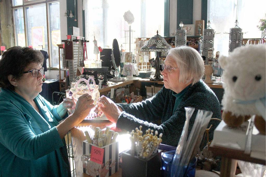 Peggy Wenham and one of her customers started reminiscing about Enumclaw’s past as Wenham rung her items up. Photo by Ray Miller-Still