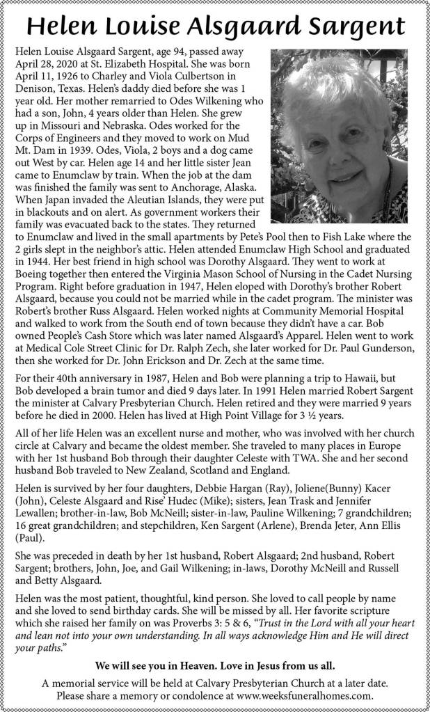 Helen Louise Alsgaard Sergant died April 28 at the age of 94.