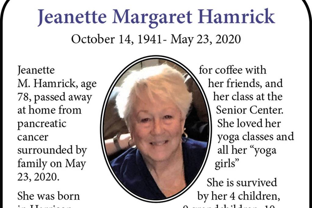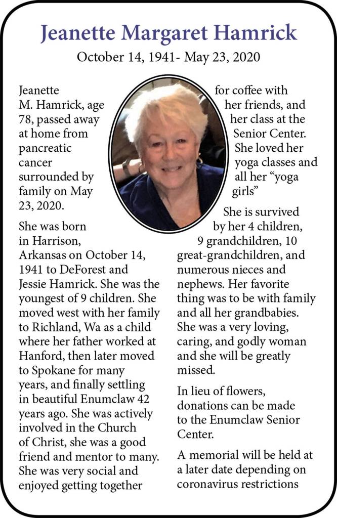 Jeanette Margaret Hamrick died May 23, 2020 at the age of 78.