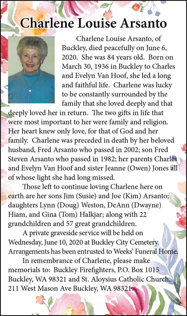 Charlene Louise Arsanto died June 6, 2020, at the age of 84.
