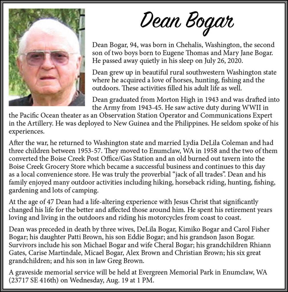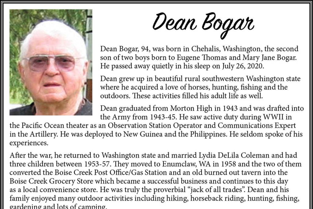 Dean Bogar died July 26, 2020, at the age of 94.