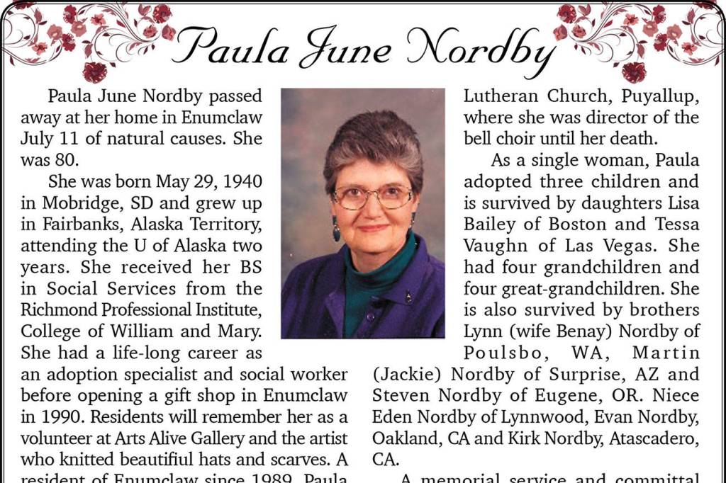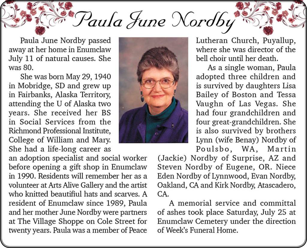 Paula June Nordby died July 11, 2020, at the age of 80.