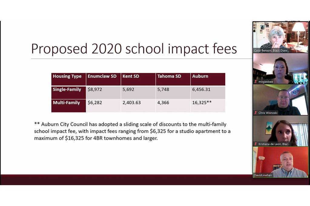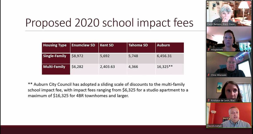 The Kent School District is requesting impact fees of $5,692 for single-family home development and $2,403.63 for multi-family developments; the Tahoma District $5,748 for single-family and $4,366 for multi-family; and Auburn wants $6,456.31 for single-family (the city of Auburn has a sliding scale for multi-family developments ranging from $6,325 for studio apartments to $16,325 for four-bedroom townhouses or larger).