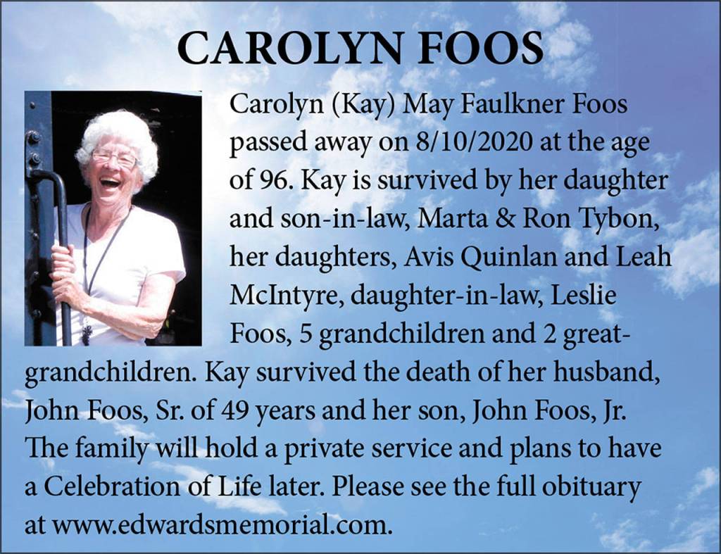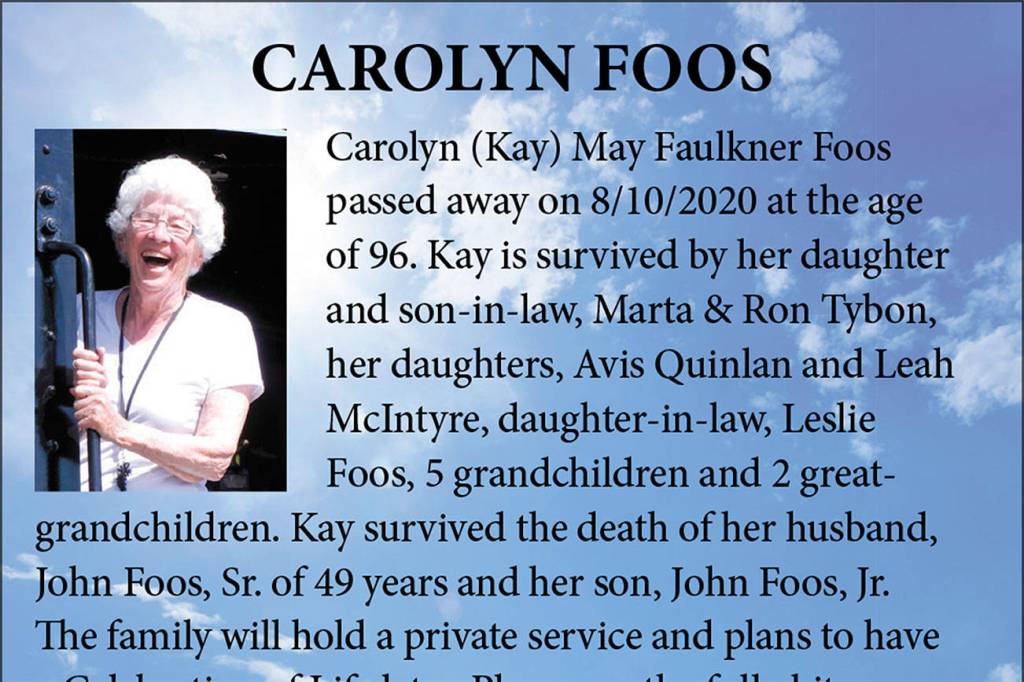 Carolyn Foos died Aug. 10, 2020, at the age of 96.