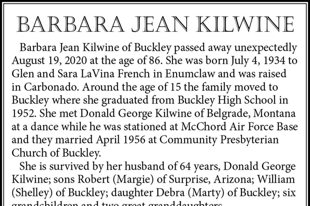 Barbara Jean Kilwine died Aug. 19 at the age of 86.
